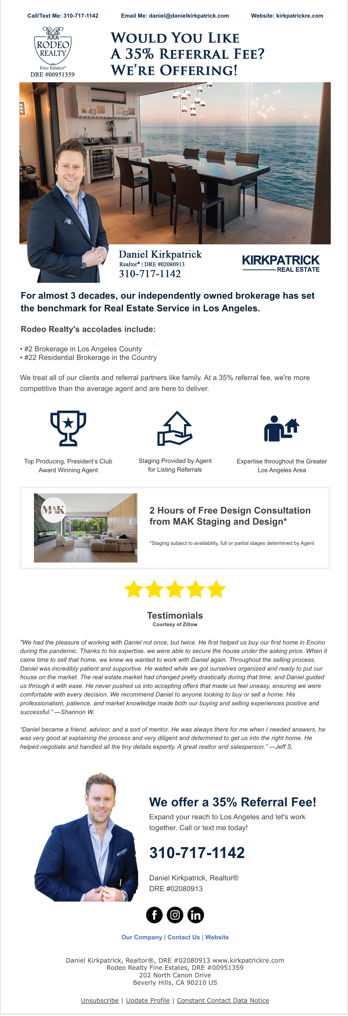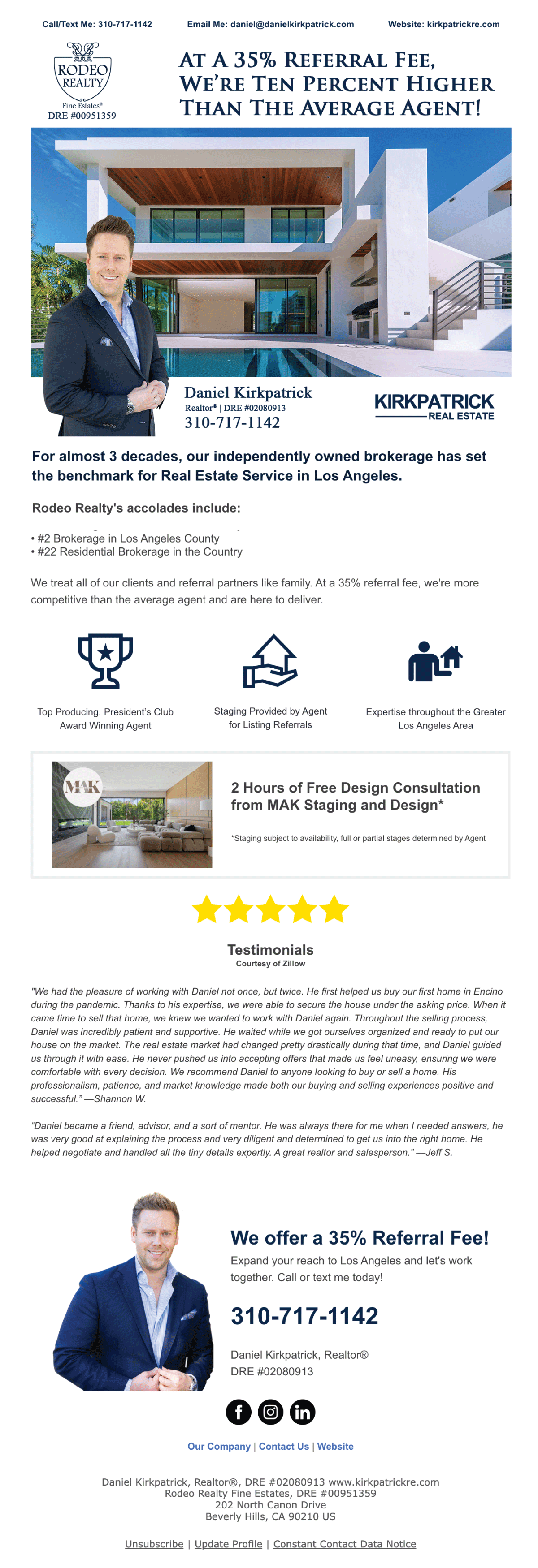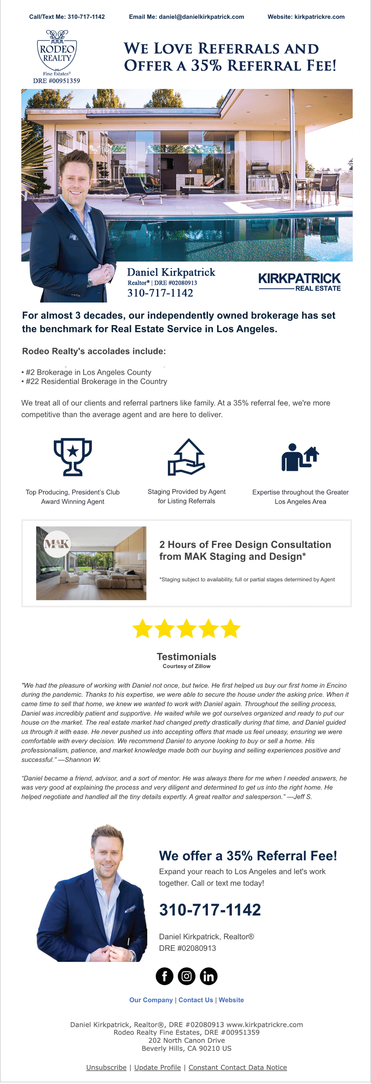 Art direction, project management and full brand execution of digital product, CRM B2B campaigns, corporate identity and collateral marketing initiatives for luxury residential Realtor, Daniel Kirkpatrick of Rodeo Realty Fine Estates.